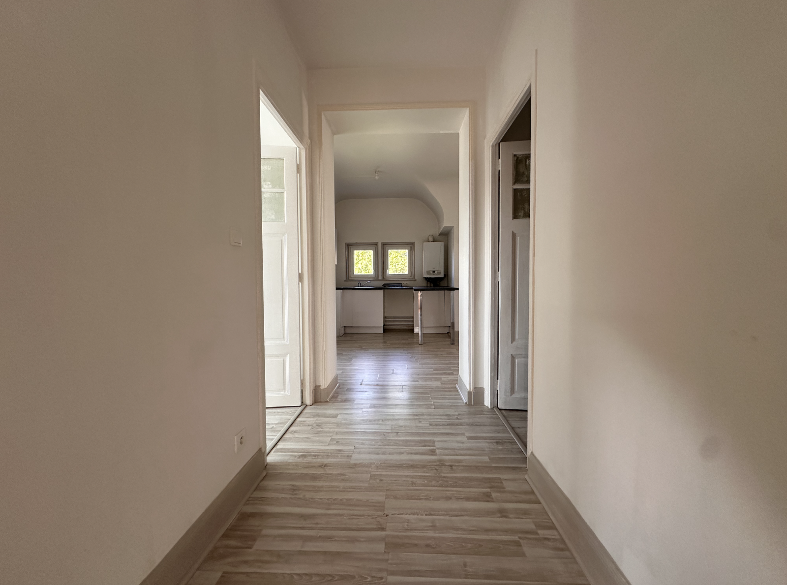 -Un appartement de 60m2 libre, comprenant: une entrée, une cuisine ouverte sur séjour avec accès terrasse/terrain, un salon, une chambre et sa salle d'eau attenante, un WC. (chauffage individuel fuel)